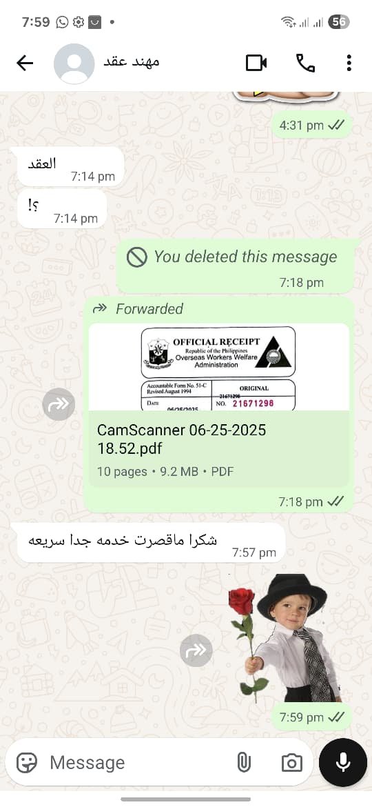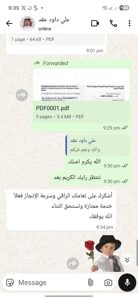 تجدد لك عقد عاملتك المنزليه او المهنية الفلبينيه اللي تسافر خروج وعوده من غير متتعب نفسك ولا تاخذ اجازه من دوامك وانت فبيتك كل اللي عليك تراسلنا علي الواتساب وخلال 24 ساعة نرسلك العقد الجديد